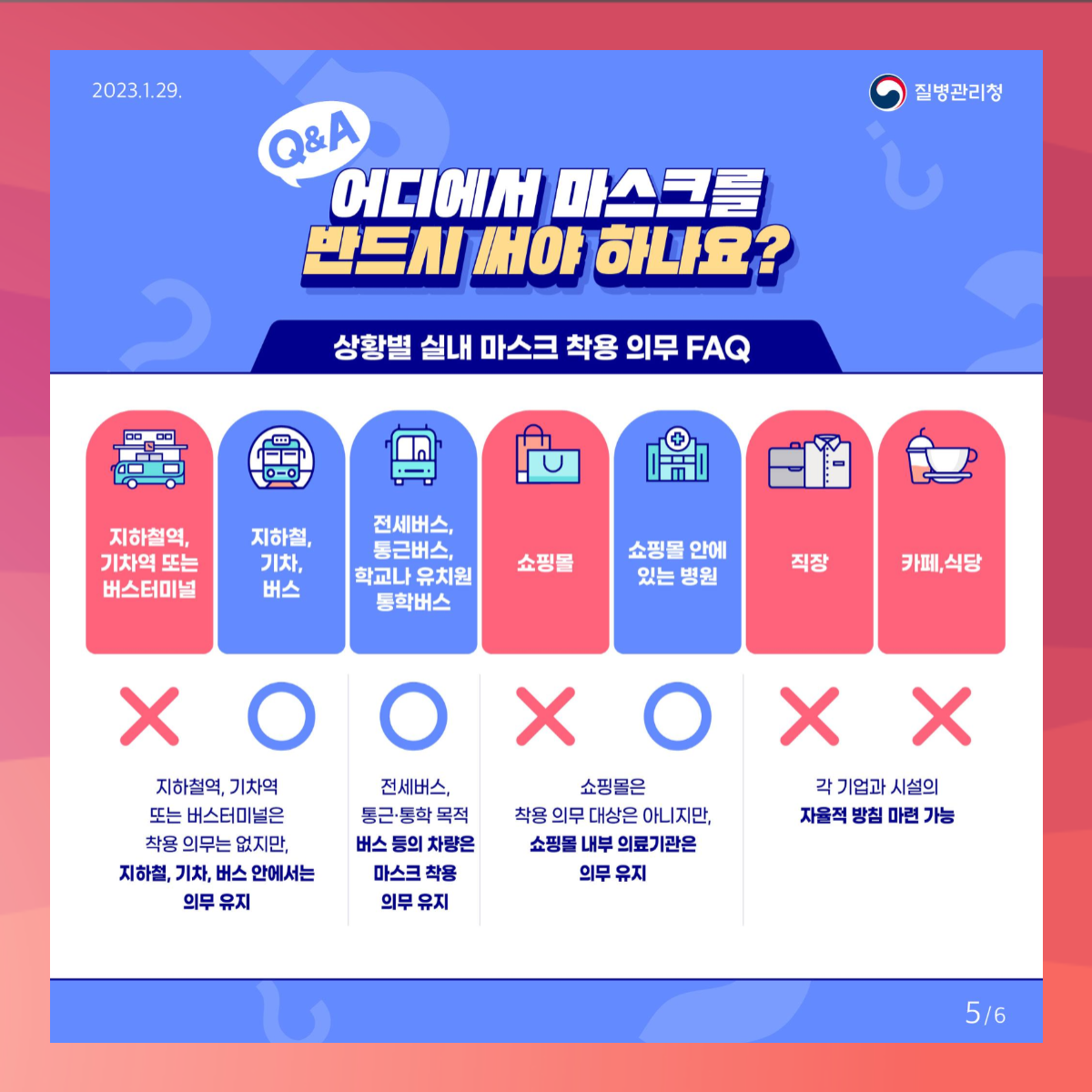 실내 마스크 의무 착용이 1월 30일부로 해지되었습니다. 관련해서 정확한 정보를 전합니다.