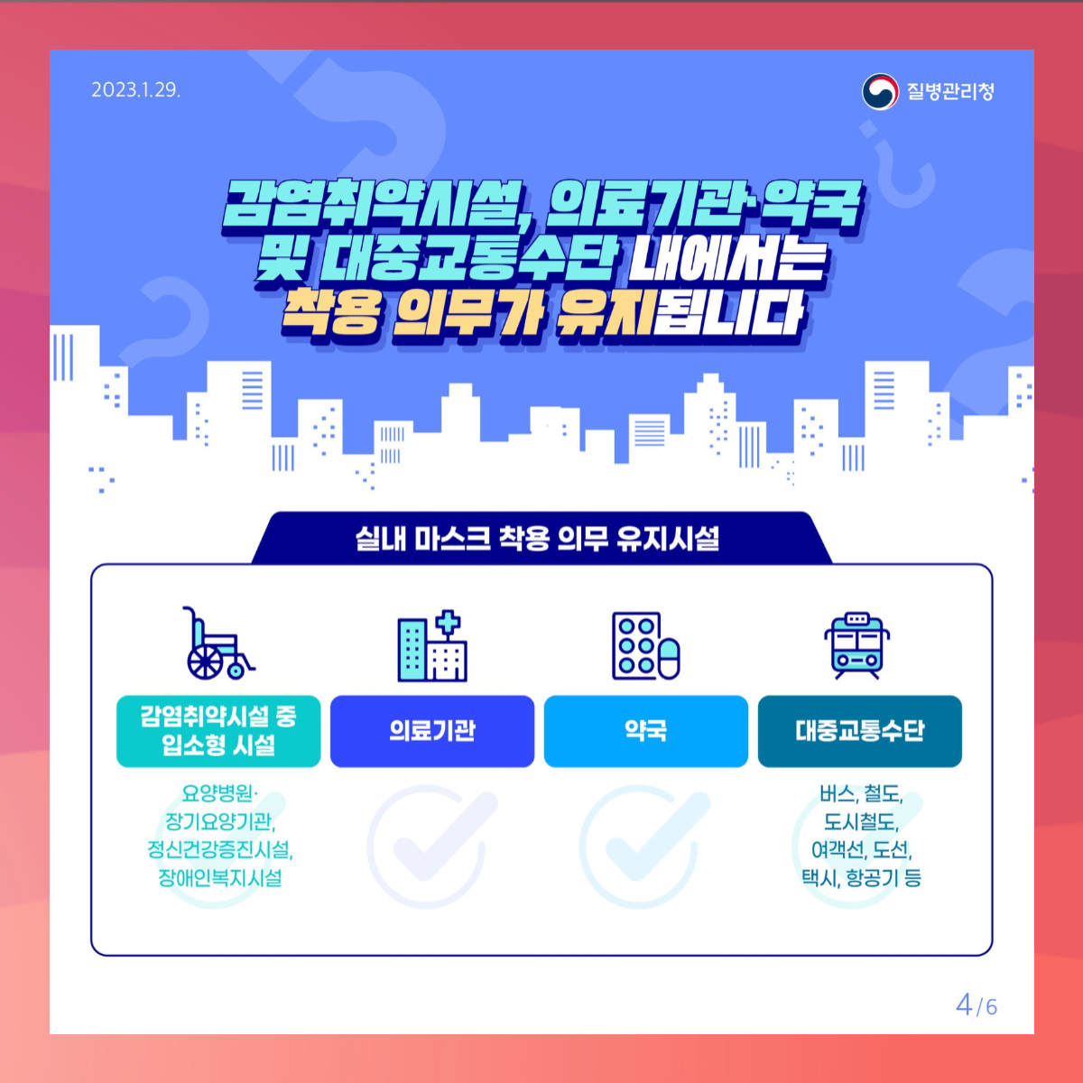 감염 지역 시설 의료기관 약국 및 대중교통수단 내에서는 작용 의무가 유지됩니다.
