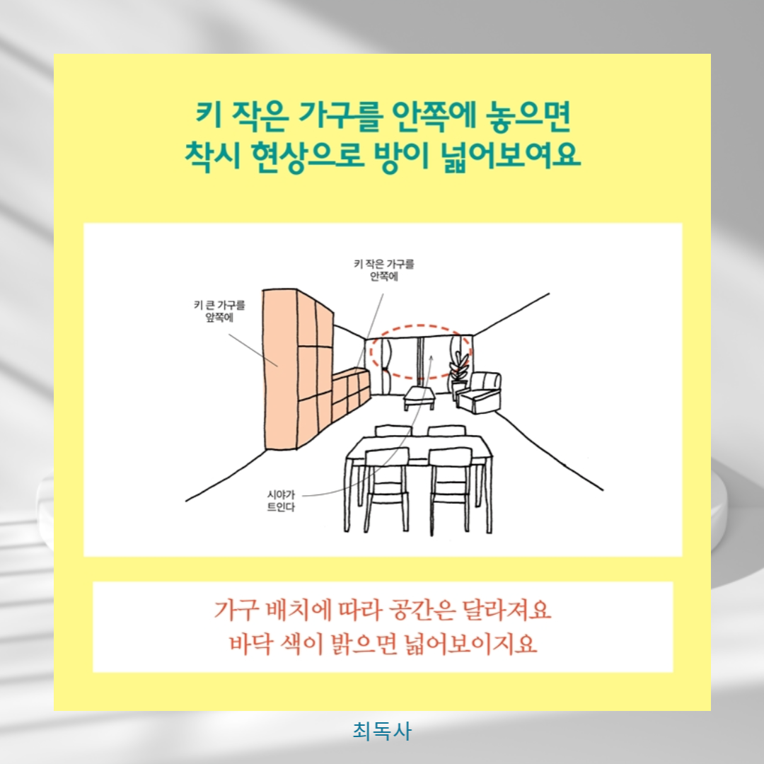 3. 키 작은 가구를 안쪽에 놓으면 착시 현상으로 방이 넓어 보입니다.