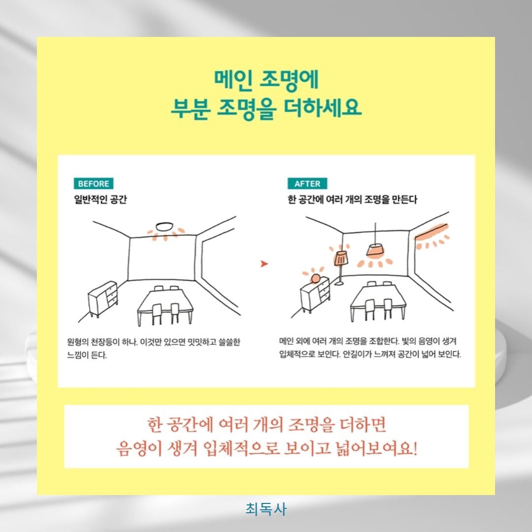 한 공간에 여러 개의 조명을 더하면 음영이 생겨 입체적으로 보이고 넓어 보입니다.