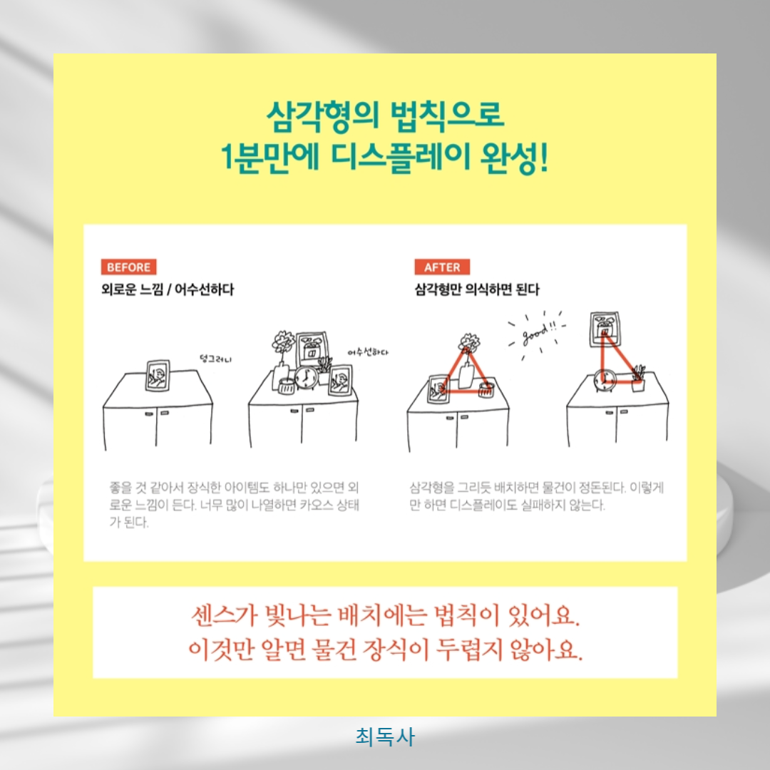 삼각형을 그리듯 배치하면 물건이 정돈됩니다.